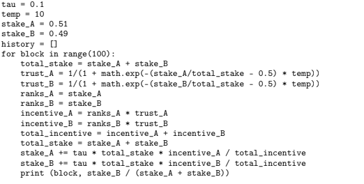 Initially, sincethe proportion of stake emitted in sub-graph A exceeds that in sub-graph B, and sub-graph A’s incentive grows super-linearly compared to B. The result is that the ratio of stakedecreases – the cabal must continually add stake to its sub-graph to maintain itself through time.