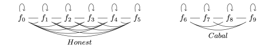 Figure 5 / The left network has low consensusThe system is not resistant to a cabal with less than 50 percent of the stake. The chain increases the number of edges set by peers until. At this point the majority of inflation flows to peers with majority consensus.