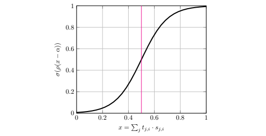 We define peers who have reached ’consensus’ as those with non-zero edges from more than 50 percent of stake in the network. (This is simply the normalized values of). To ensure the mechanism is differentiable we define this computation using the continuous sigmoid function. The sigmoid produces a threshold-like scaling that rewards connected peers and punishes the non-trusted. The steepness and threshold point can be modulated through a temperature ρ and shift term κ.