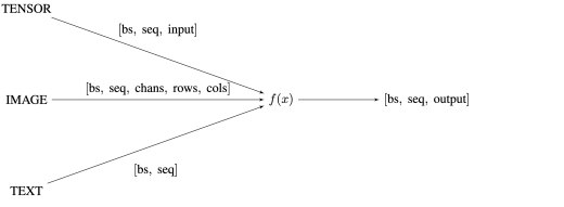 A common encoding of inputs and outputs is required for the various model types and input types to interact. The use of tensor modalities can be used to partition the network into disjoint graphs. At the beginning, the network can be seeded with a single modality TEXT, then expanded to include IMAGE, SPEECH, and TENSOR. Eventually, combinations of these modalities can be added; for instance TEXT-IMAGE, to bridge the network into the multi-modality landscape. Incentives to connect modalities can be integrated with the same trust scaling suggested in section (`2`). Eventually, successful models should accept inputs from any modality and process them into a useful representation. For consistency, we can use a standard output shape across the network [batch_size, sequence_dim, output_dim] similar to the common tensor-shapes produced by language and image models – and extend this size as the network increases in complexity.